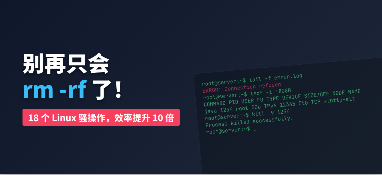 别再只会 `rm -rf` 了!这 18 个 Linux 骚操作,让你的同事直呼内行 默认分类 摘要:拒绝无效加班。从日志分析到进程管理,这 18 个 Linux 命令行技巧,不仅能救火,还能让你在终端运指如飞。收藏这一篇就够了。凌晨 2 点,线上服务突然报警。你揉着惺忪的睡眼打开终端,面对黑压压的屏幕和几个 G 的日志文件,还在用 cat 甚至 vim 一行行往下翻?停下!这简直是在慢性自杀