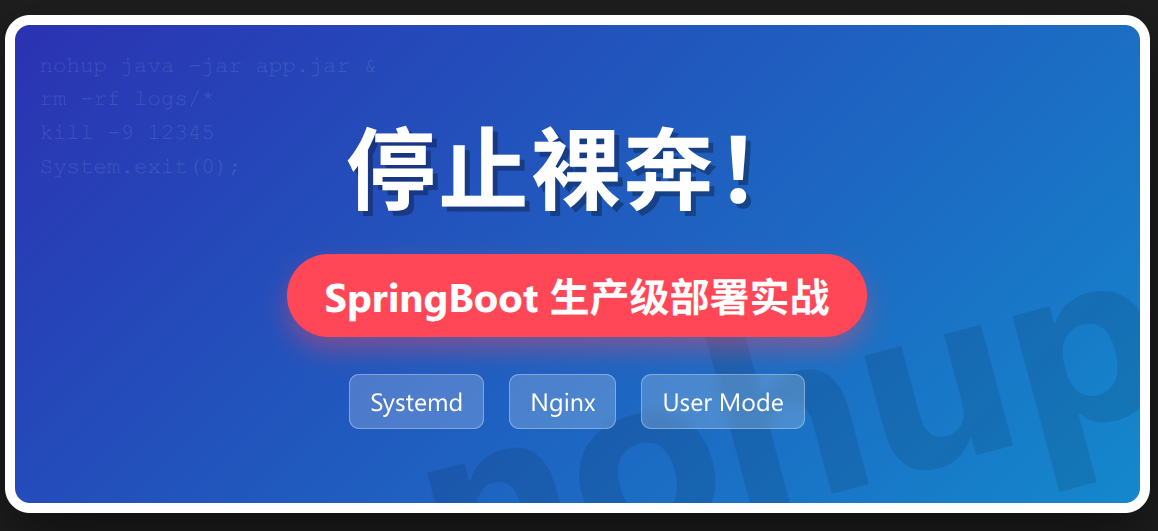 停止用 nohup 启动生产!教你企业级 SpringBoot 部署方案(含无 Root 版) 默认分类 别再 nohup 了!这才是 SpringBoot 企业级部署的正确姿势 (Systemd + Nginx)停止用 nohup 启动生产!教你企业级 SpringBoot 部署方案(含无 Root 版)摘要: 还在用 java -jar 配合 nohup 跑生产?服务器重启服务就挂?日志文件乱成一团