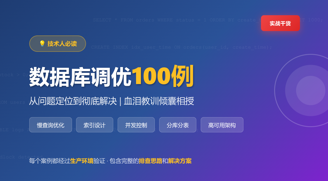 这篇文章,不讲玄学、不讲空话。 100 个真实可复用的数据库调优案例,带你从 报警 → 定位 → 修复 → 复盘,建立一套真正能救命的数据库调优方法论。