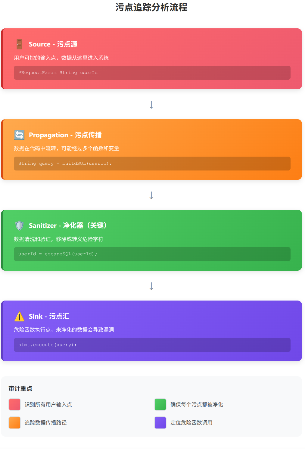 污点追踪是代码审计中最重要的技术之一。它的核心思想是:将用户输入标记为"污点",追踪这些污点数据在代码中的流动路径,检查是否在到达危险函数前经过了适当的清洗。
