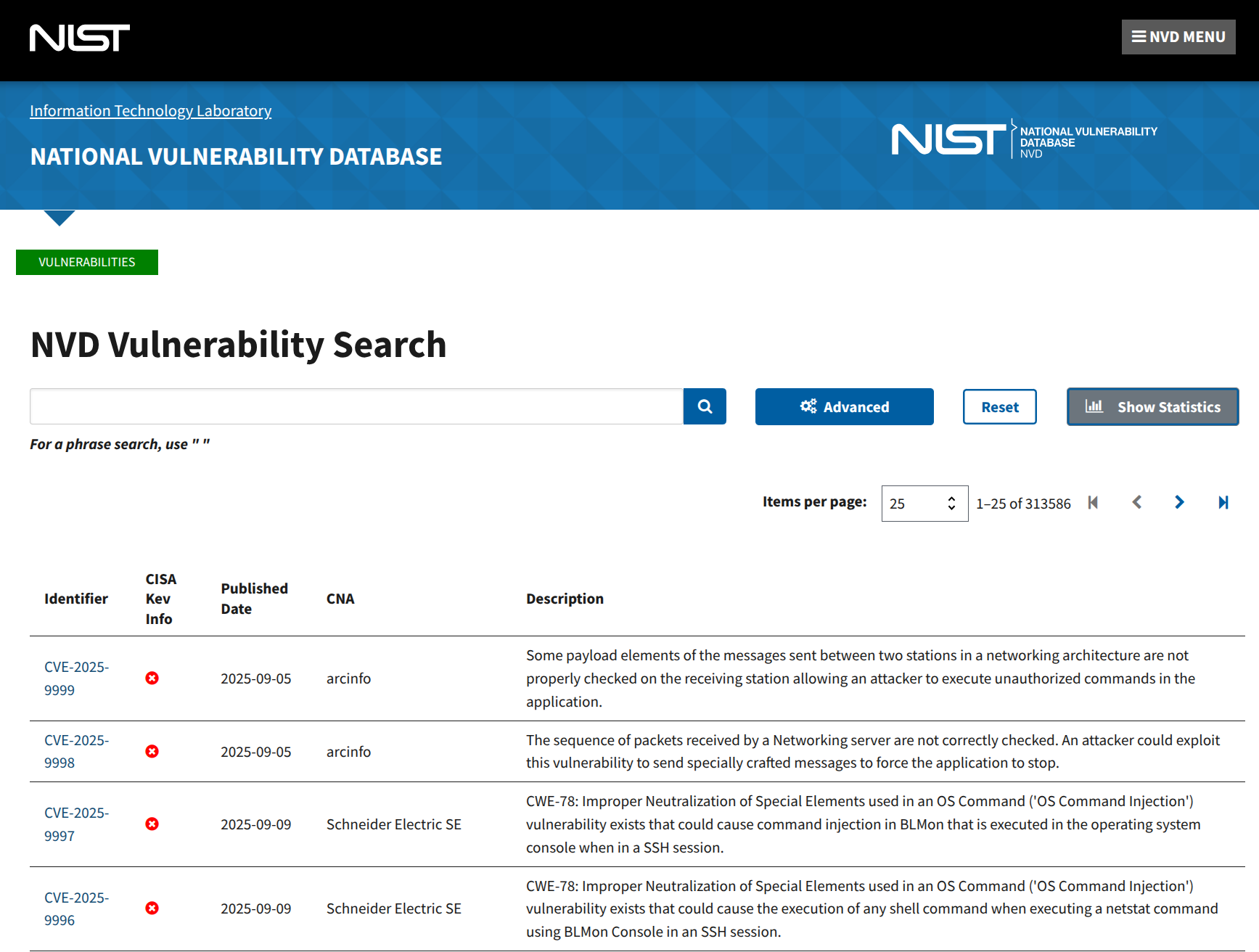 这是网络安全领域最基础也最重要的漏洞列表。自1989年创建以来,CVE已经成为全球通用的漏洞标识体系。每个漏洞都有唯一的CVE编号,这让不同组织之间的漏洞沟通变得标准化。截至2025年10月,CVE已收录超过29万+个漏洞条目,几乎涵盖了所有公开披露的安全问题。