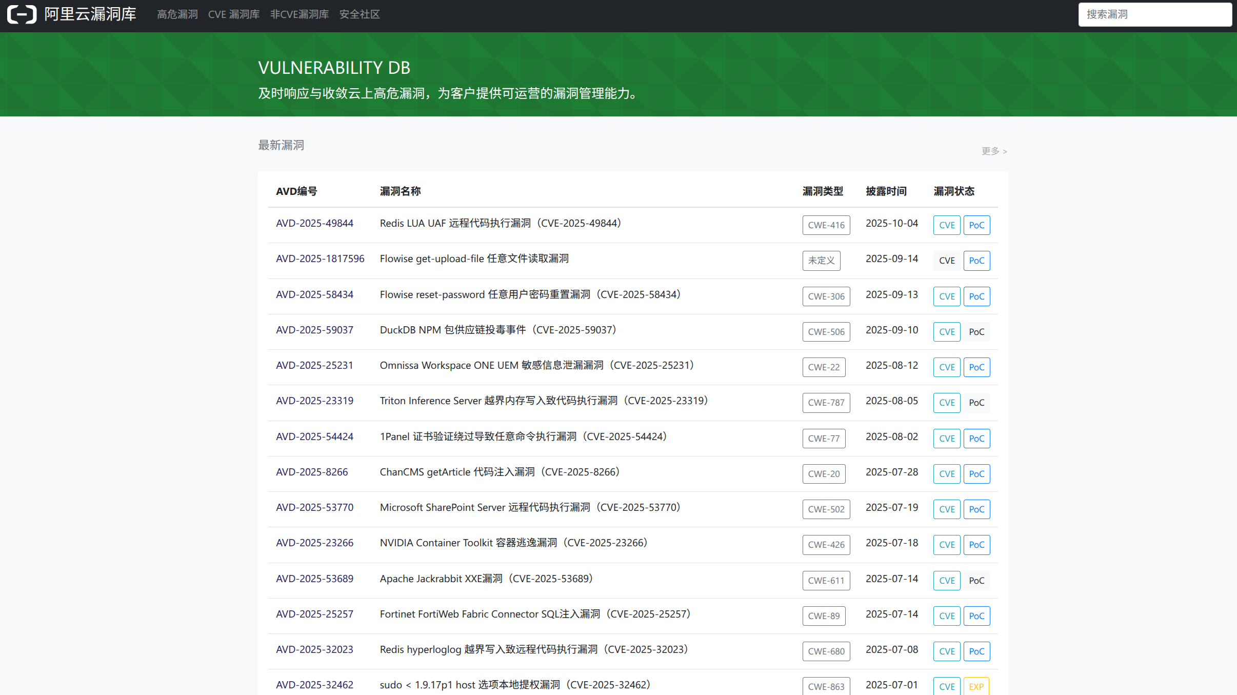 阿里云依托自身在云安全领域的深厚积累,打造了这个面向开发者和安全团队的漏洞平台。AVD的特色在于对云原生技术栈漏洞的关注,以及与阿里云安全产品的深度整合。
