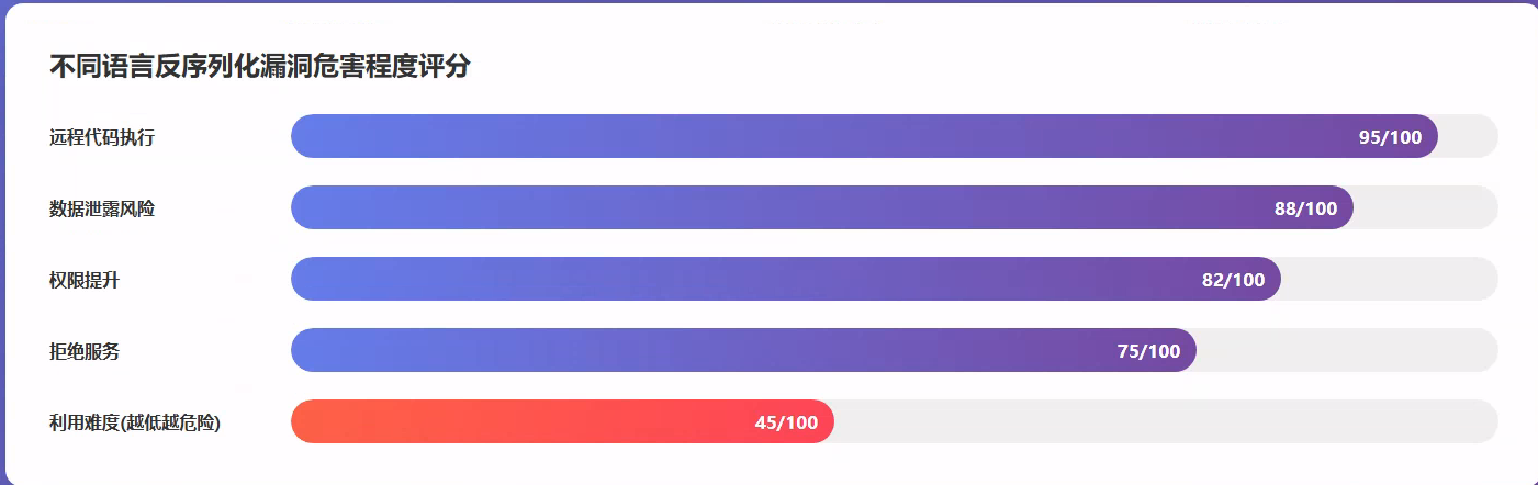反序列化漏洞的危害等级通常被评为"严重",因为成功利用该漏洞往往能直接获取服务器权限,造成数据泄露、服务瘫痪等严重后果。