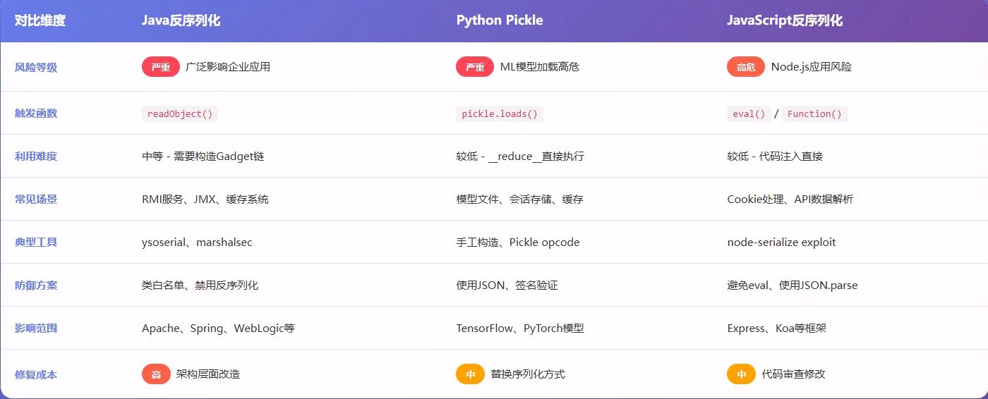 在现代Web应用开发中,序列化和反序列化已经成为数据传输和存储的常用技术。然而,不当的反序列化操作往往会引发严重的安全漏洞,攻击者可以通过精心构造的恶意数据实现远程代码执行、权限提升等高危攻击。本文将深入剖析多种语言环境下的反序列化漏洞原理、利用方式及防御策略。