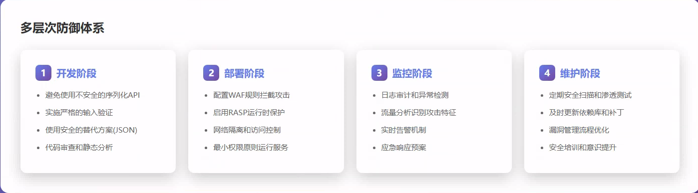 构建完善的反序列化漏洞防御体系需要从多个层面入手: