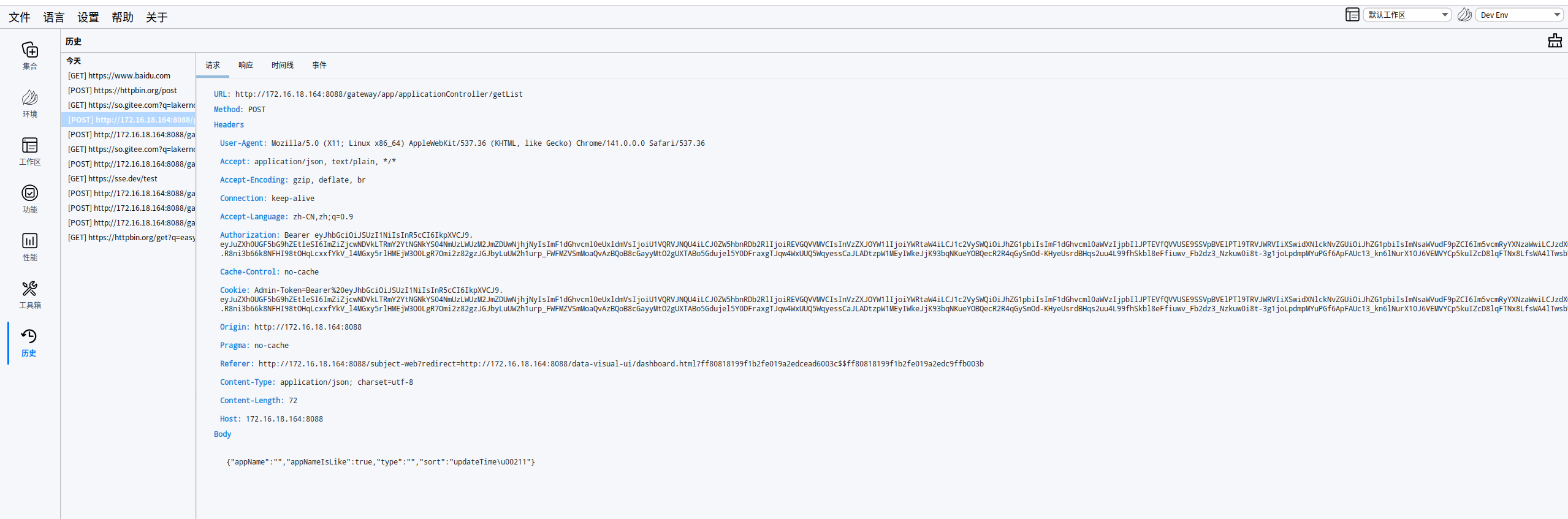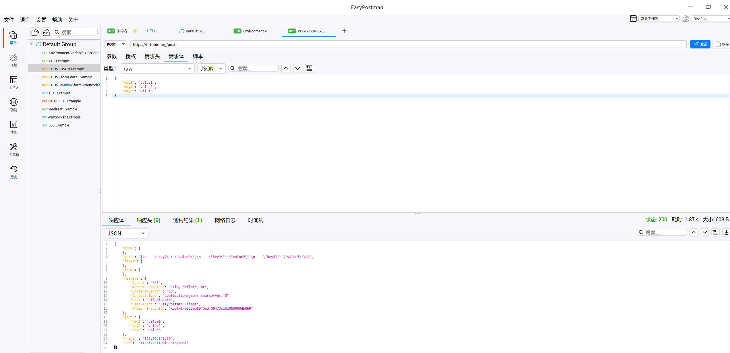 界面布局非常经典,左侧是集合栏,右侧是请求编辑器。
