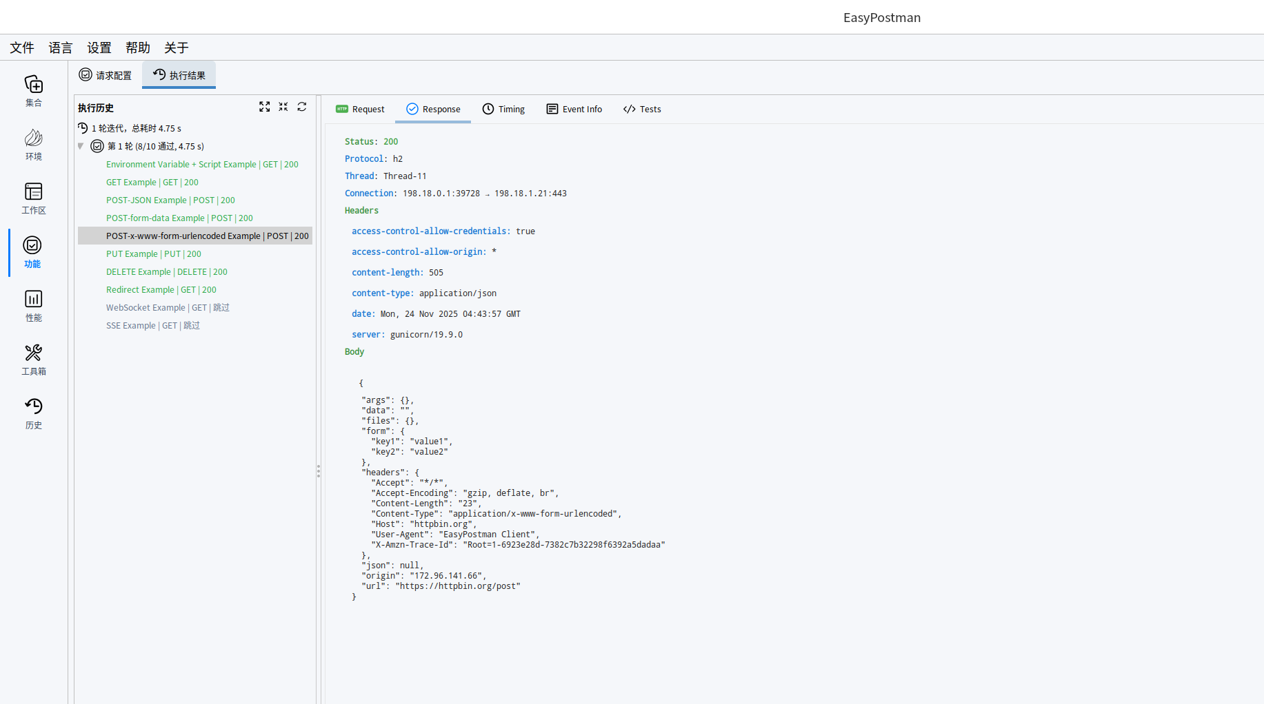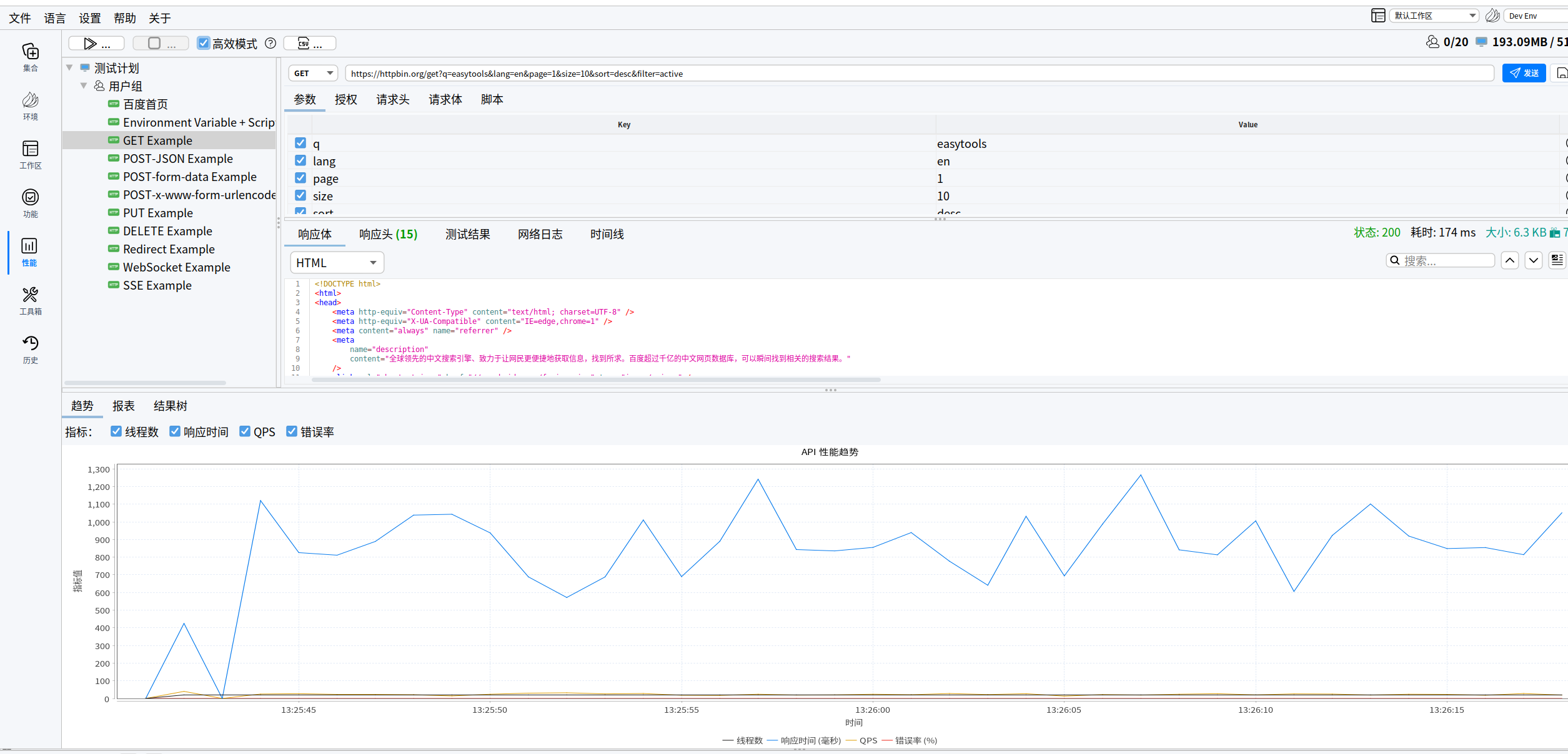 - 批量请求与压力测试(简易版 JMeter),满足多场景需求,支持报告、结果树、趋势图可视化