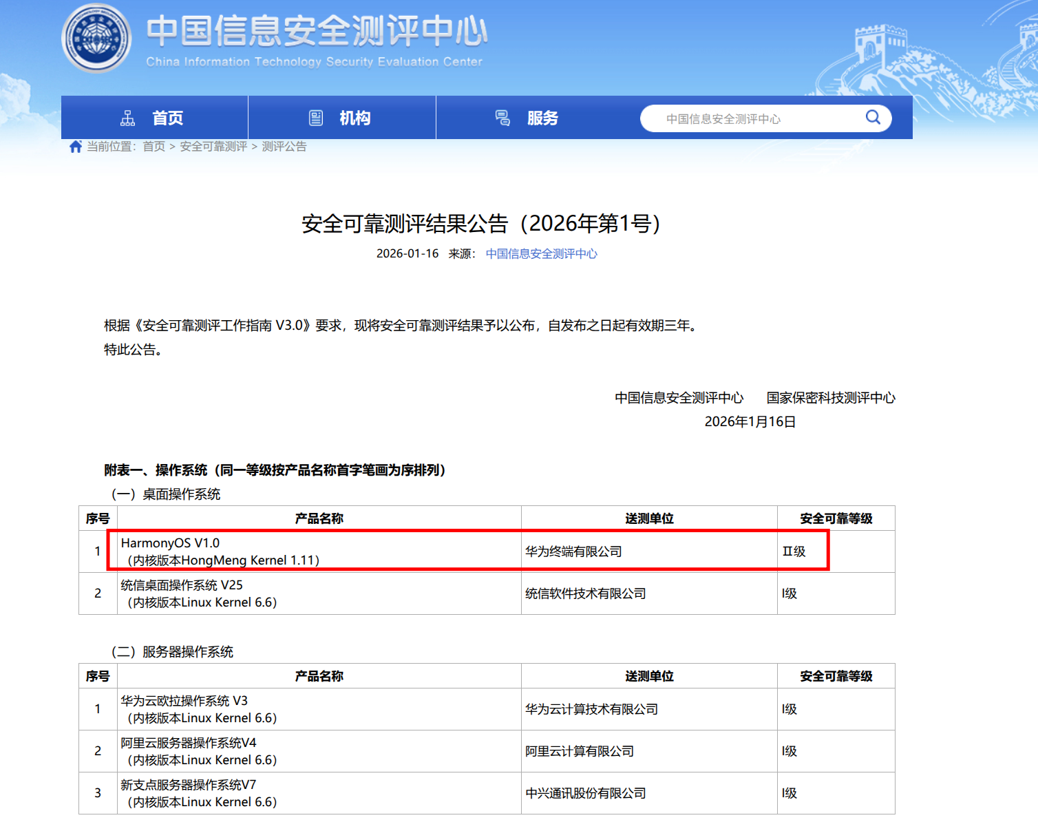 1月16日,中国信息安全测评中心官网正式发布《安全可靠测评结果公告(2026年第1号)》(有效期3年)——华为鸿蒙桌面操作系统 HarmonyOS V1.0(HongMeng Kernel 1.11),以唯一Ⅱ级的高分通过国家最高安全可靠评测!