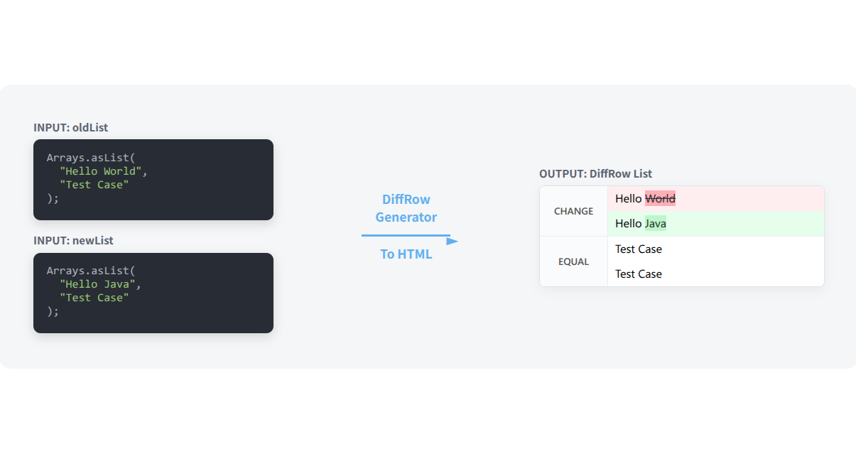 我们需要使用 DiffRowGenerator。下图展示了它如何将原始数据转换为带 HTML 标记的 DiffRow。