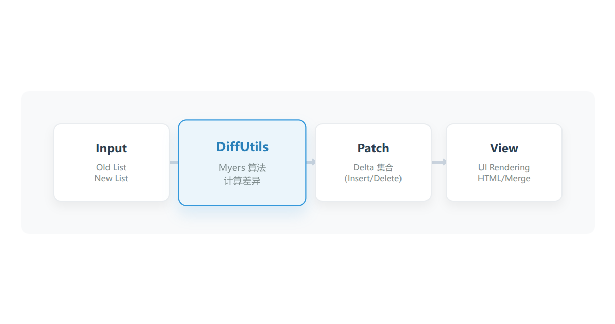 DiffUtils:工具入口。负责计算差异(diff)和应用差异(patch)。Patch(补丁):差异的集合。它保存了从“旧文件”变到“新文件”所需的所有步骤。Delta(差异点):Patch中的最小单元,代表一处具体的变更。INSERT:新增DELETE:删除CHANGE:修改