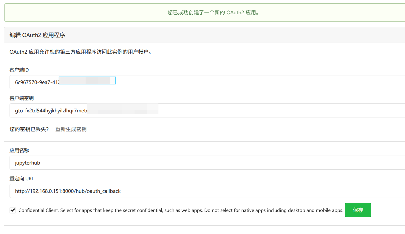 - 点击“创建应用”。Gitea会立即生成一个 客户端ID 和一个 客户端密钥。请复制并妥善保管这两个值。