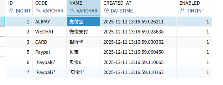 INSERT INTO schedule_develop.payment_method (id, code, name, enabled) VALUES ('1', 'ALIPAY', '支付宝', 1);