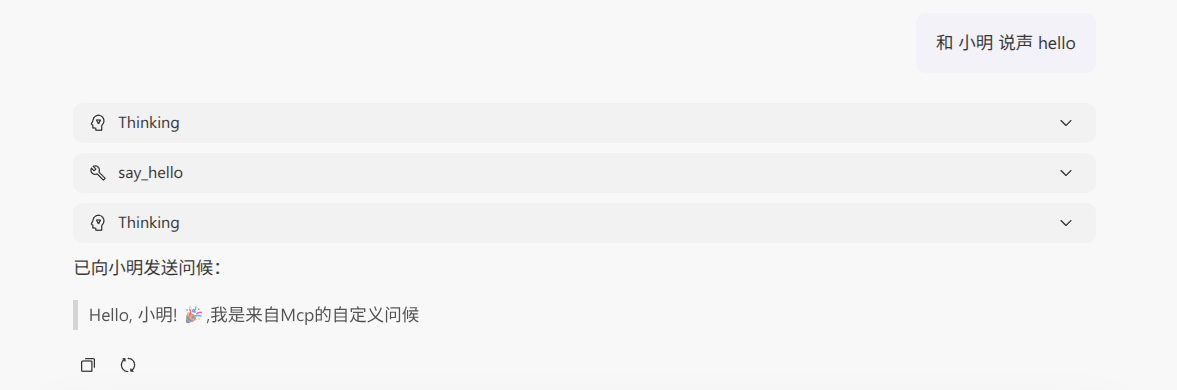 测试:对 AI 说 "用 say_hello 工具跟小明打个招呼"
