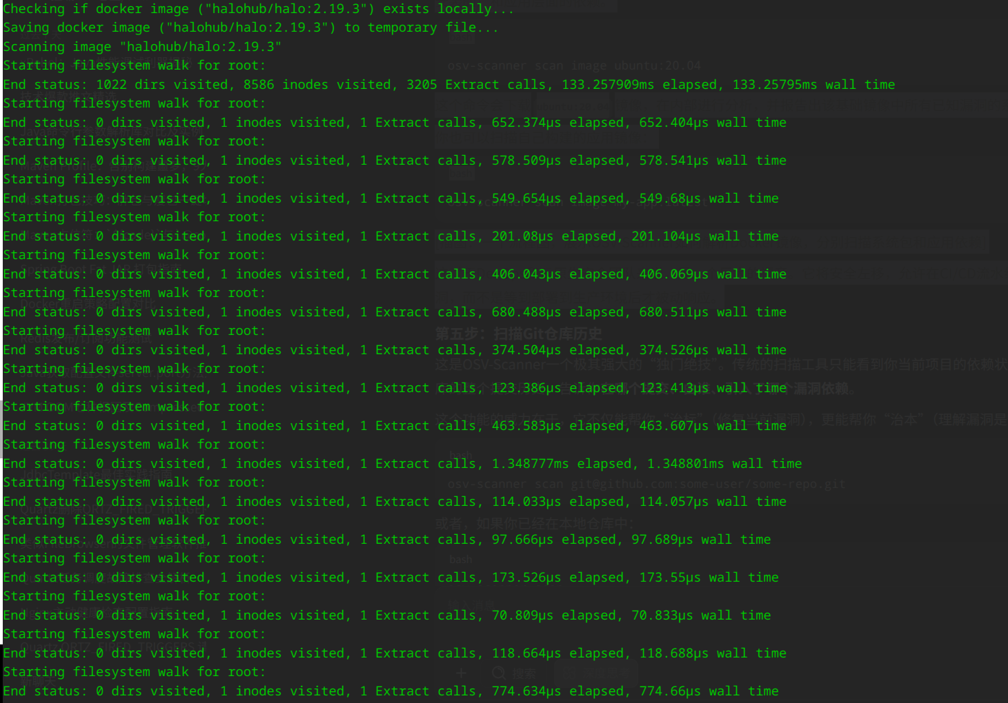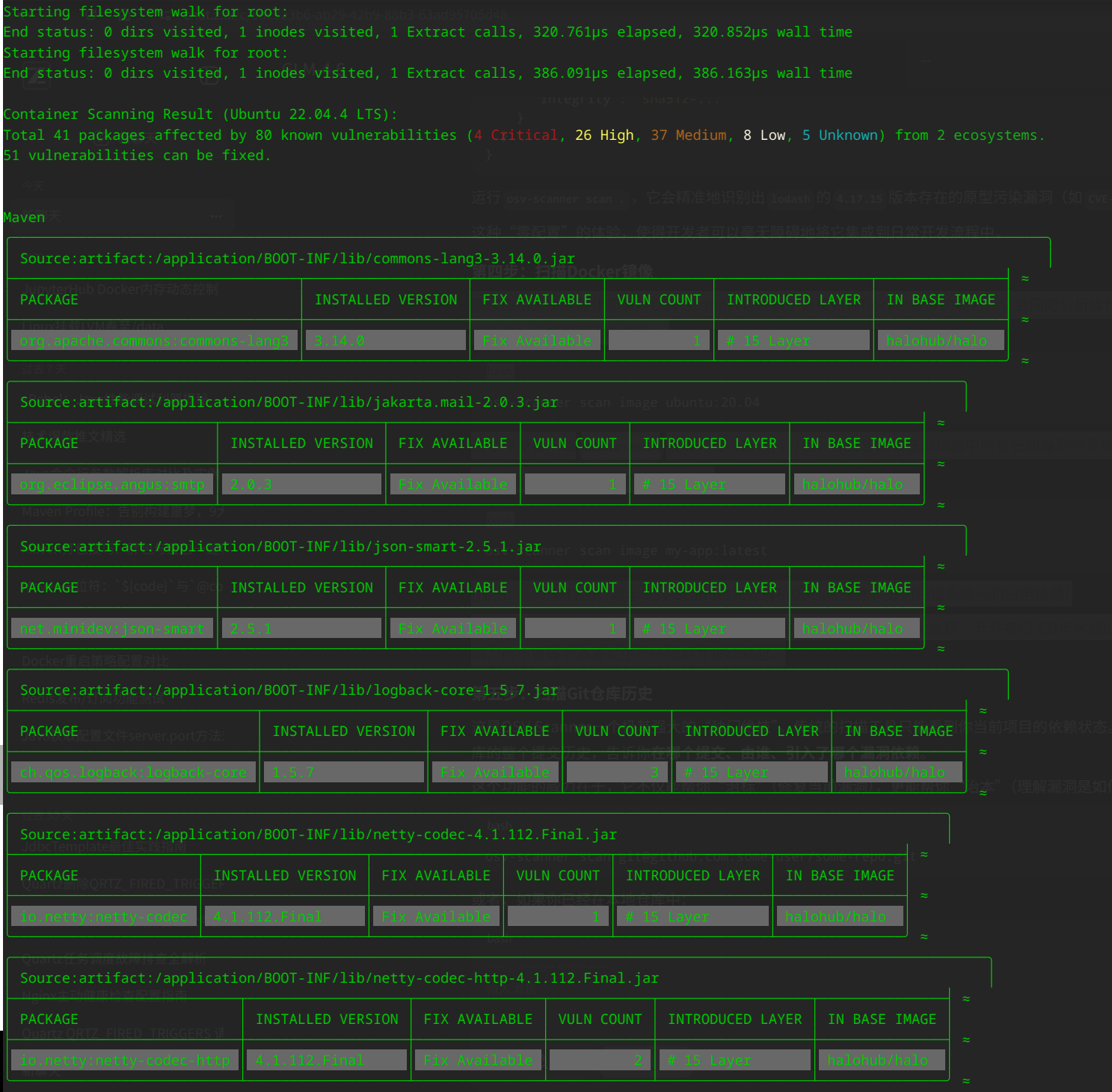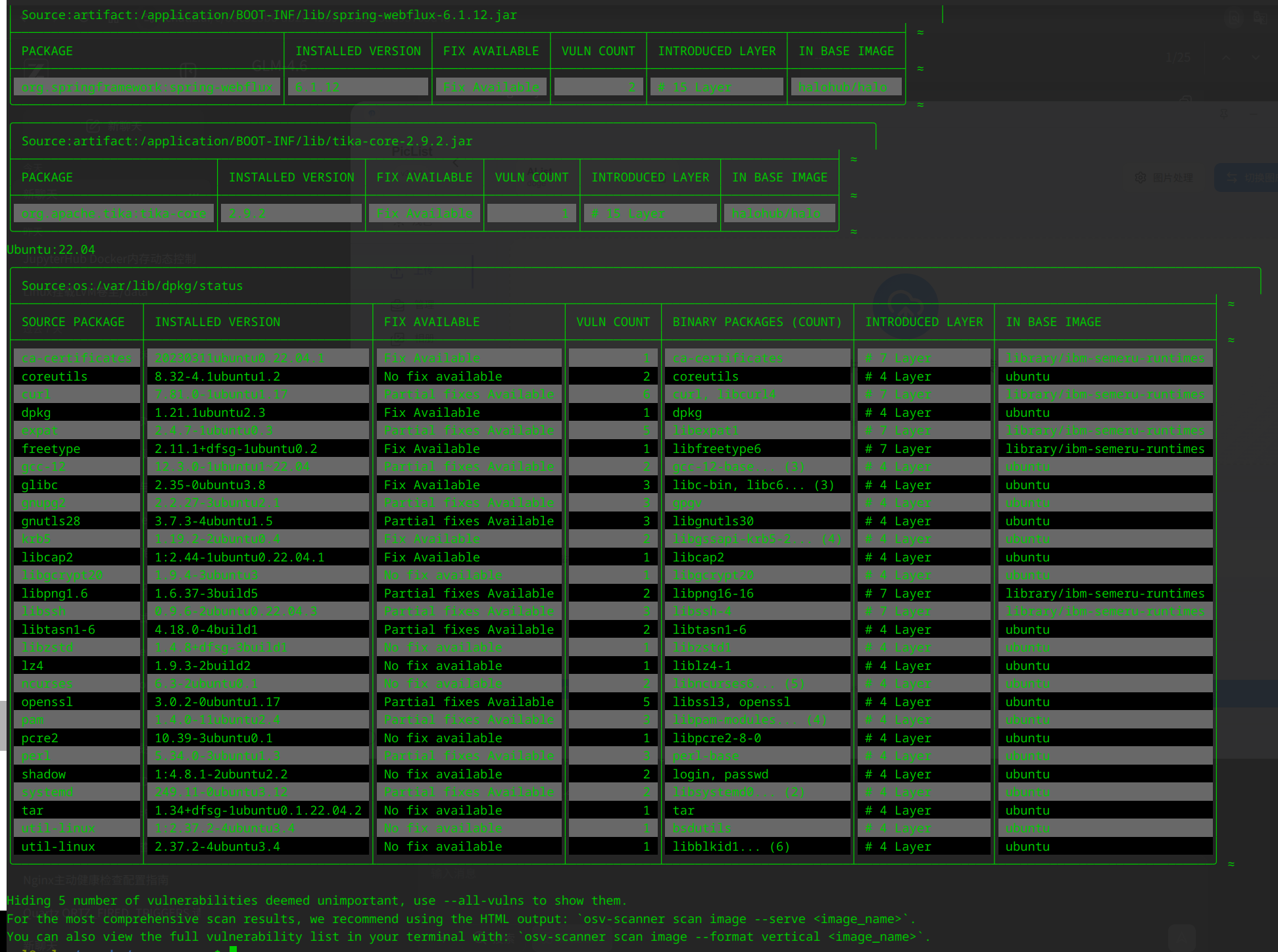 这个命令会下载halohub/halo:2.19.3镜像(如果本地已存在则不会再去下载),在内部进行分析,并报告出该基础镜像中所有已知漏洞的系统包,比如openssl, curl, bash等。