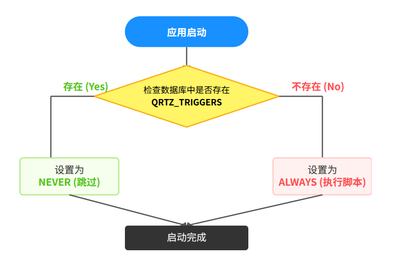 schema-mysql.sql)第一行通常是DROP TABLE IF EXISTS。每次服务重启,任务全没了! - 选 NEVER:安全是安全,但部署新环境(特别是 DevOps 自动部署或交付给客户私有化部署)时,必须让 DBA 手动导脚本,极易漏导或版本不一致。