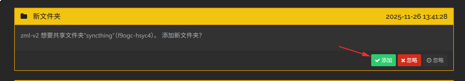 - 保存后,B 的界面会弹出一个提示“A 想要共享文件夹”,点击“添加”,设置好 B 本地的路径即可。