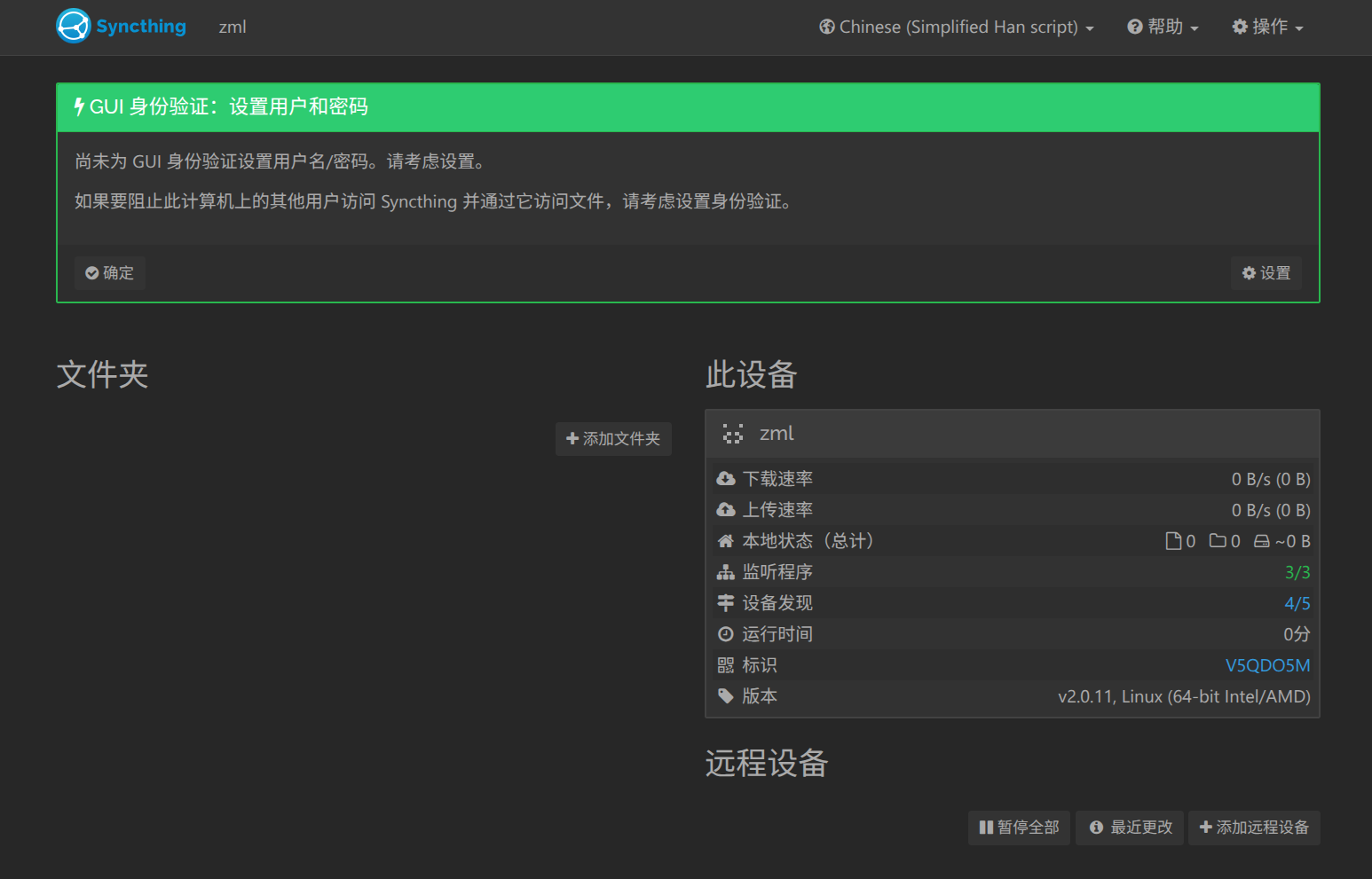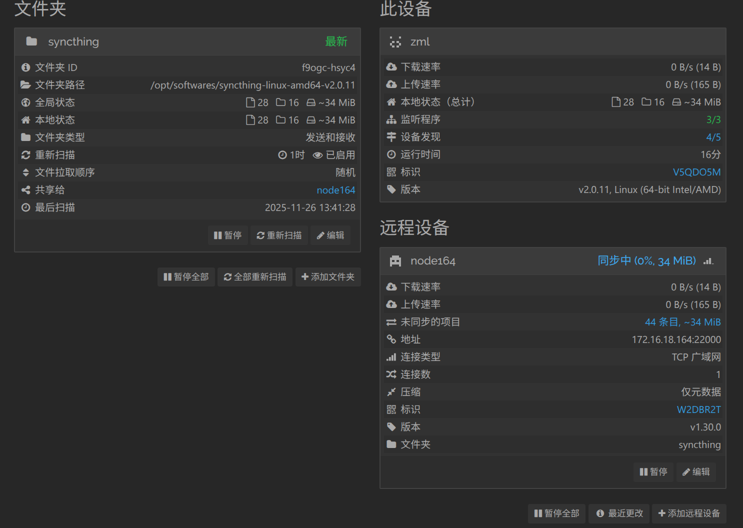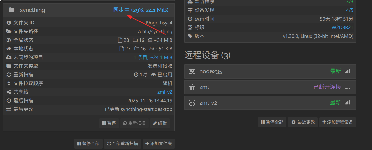 调整后,检查 Syncthing 是否恢复正常: