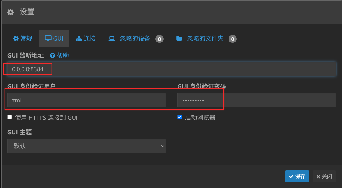 <gui>标签部分,将<address>127.0.0.1:8384</address>修改为0.0.0.0:8384。<gui enabled="true" tls="false" debugging="false"> <!-- 修改此处为 0.0.0.0:8384 --> <address>0.0.0.0:8384</address> <apikey>...</apikey> <theme>default</theme> </gui> -