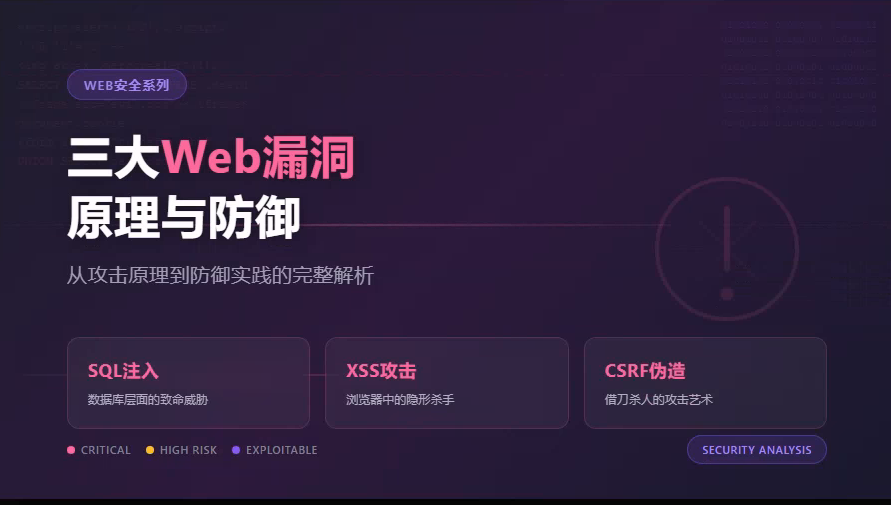 Web应用安全始终是网络安全领域的重点战场。据统计,超过70%的安全事件都发生在应用层。今天我们来深入剖析三个最常见也最危险的Web漏洞:SQL注入、XSS跨站脚本攻击和CSRF跨站请求伪造。这不是一篇简单的概念介绍,而是从攻击原理、利用场景到防御方案的完整技术解析。
