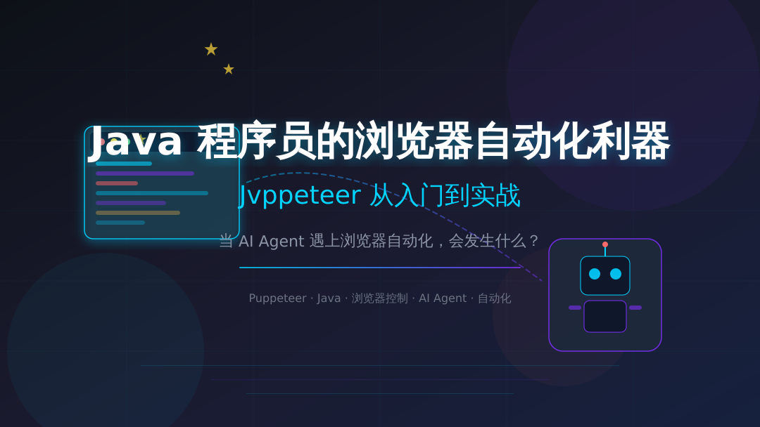 Java 程序员的浏览器自动化利器:Jvppeteer 从入门到实战先说个事实:在浏览器自动化这个领域,Node.js 的 Puppeteer 已经统治了好几年。Python 有 Playwright 做替代,Go 有 chromedp,唯独 Java 这边一直缺一个"用起来顺手"